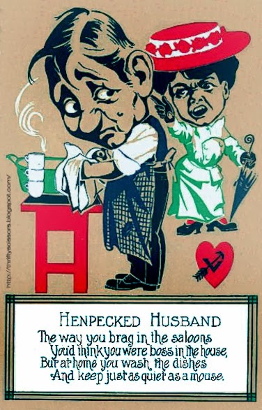 | Henpecked Husband: "The way you brag in the saloons you'd think you were boss in the house, but at home you wash the dishes and keep just as quiet as a mouse. |